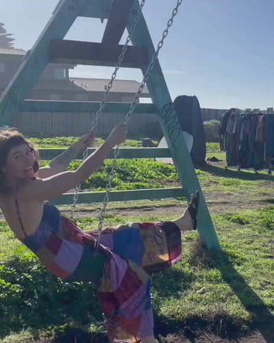This jumpsuit feature a vibrant patchwork design, over-dyed to enhance and brighten the colors. It features a smocked top, adjustable shoulder straps, and adjustable leg ties for a customizable, comfortable fit. Perfect for casual outings or layered with your favorite accessories. Each pair is one-of-a-kind, reflecting the artisan craftsmanship of Nepal.
